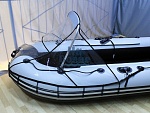 В комплекте с носовым тентом идет прочный дюралюминиевый каркас, инструкция по установке и специальный клей. Дуги каркаса крепятся на баллоны лодки с помощью пятаков и клея. После этого на каркас с тентом можно устанавливать на лодку. По нижнему краю тента мы пришиваем специальные крючки, с помощью которых тент крепится за привальный брус на баллонах лодки. Такой способ крепления – самый надежный и легкий, позволяет обойтись без затекания воды под носовой тент во время движения и гарантирует устойчивое положение тента даже во время быстрого движения вперед или назад.